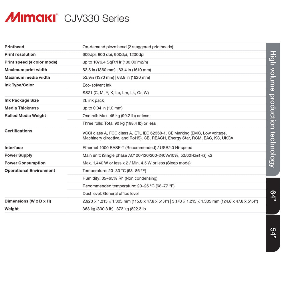 Mimaki CJV330 High Volume Production integrated Printer/Cutter Commercial Print and Cut CapabilitiesHigh quality and high productivity with unimaginable added value and unparalleled ease of use... The 330 series of the new generation have been designed and developed from the ground up with a casing to pursue image quality and productivity befitting a flagship model and new values that assist in saving work. Compatible with Mimaki Original Eco-Solvent inks this print & cut device offers commercial level workflows and quality for high demand print businesses. Capable of producing a wide range of sign & graphic applications including durable banners, signs, decals, posters, and more for internal and external use. *This product is excluded from all promotional discounts and offers. |