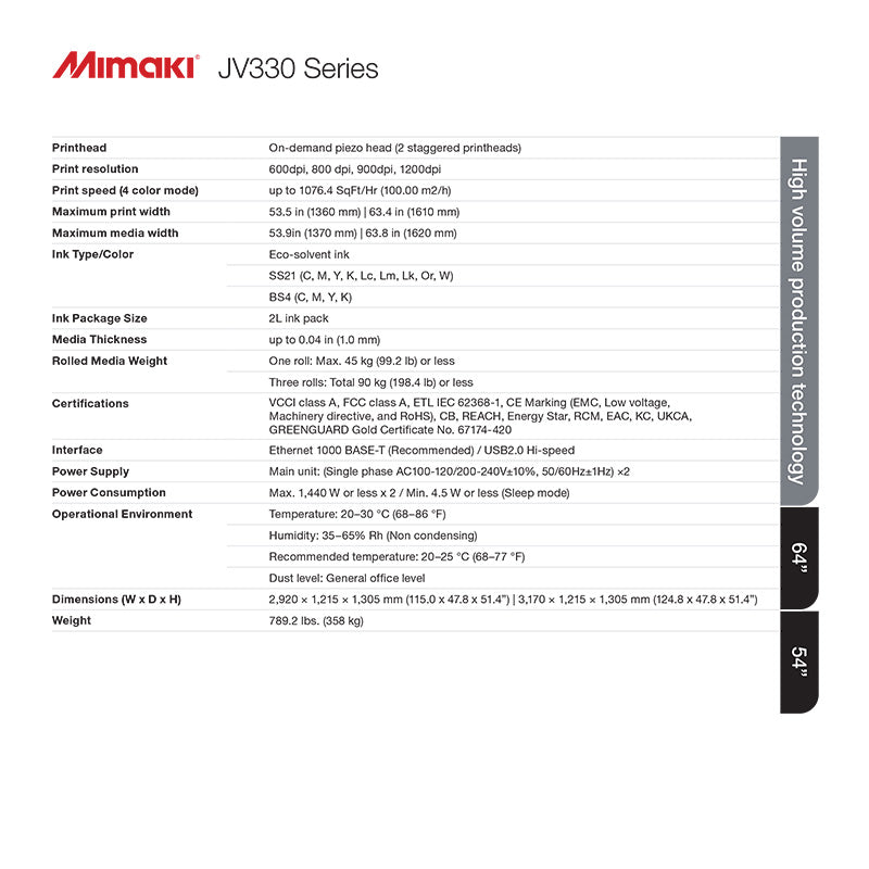 Mimaki JV330 Roll to Roll Eco-solvent Inkjet Printer High Volume Production TechnologyCompatible with Mimaki Original Eco-Solvent inks this printer offers commercial level workflows and quality for high demand print businesses. Capable of producing a wide range of sign & graphic applications including durable banners, signs, posters, and more for internal and external use. *This product is excluded from all promotional discounts and offers. |